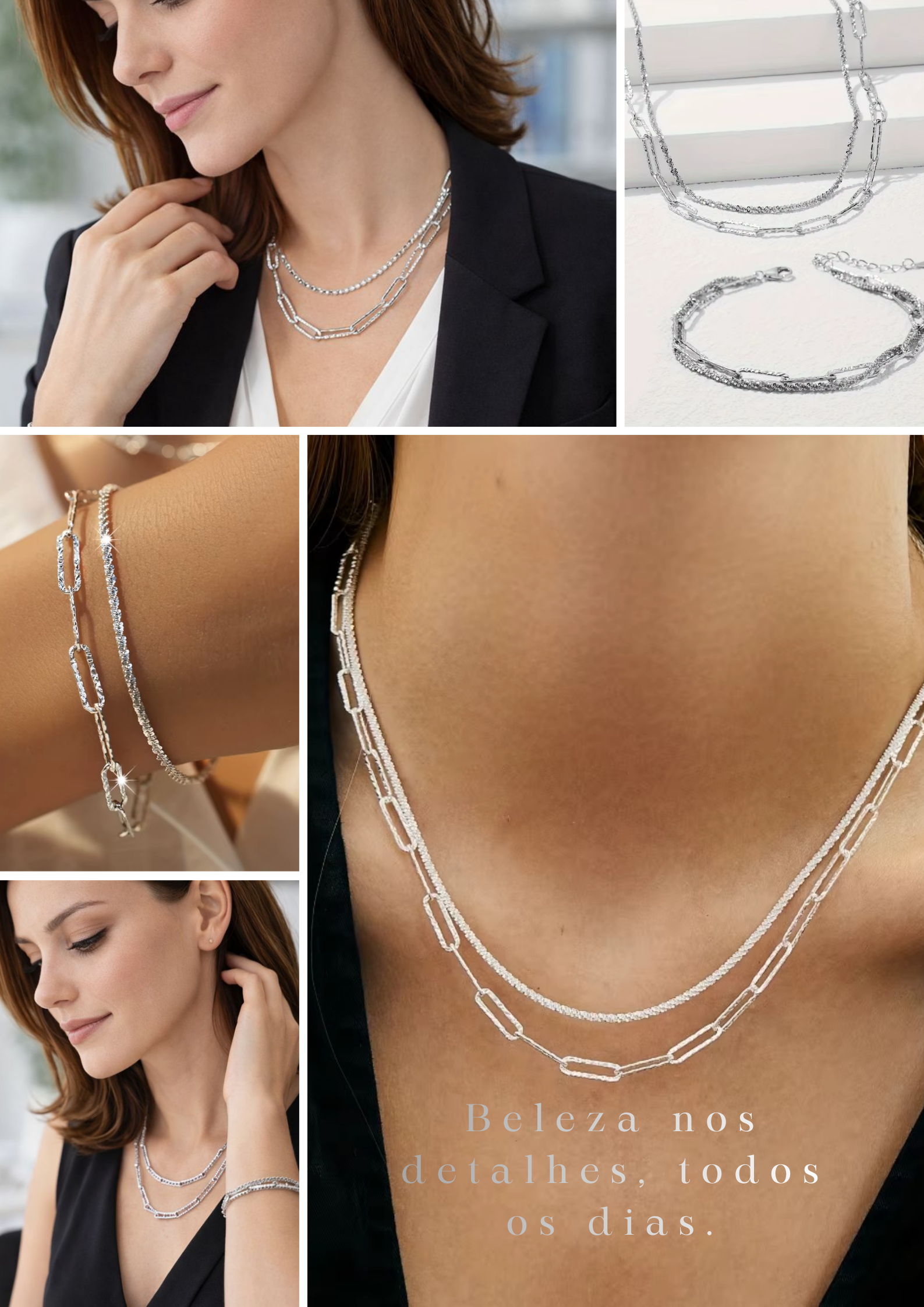 O design dos elos traz personalidade à peça, enquanto o brilho suave adiciona charme na medida certa. É aquele tipo de conjunto que combina com looks casuais bem-arrumados, acompanha produções do dia a dia e também funciona perfeitamente à noite, adaptando-se ao seu estilo com facilidade.