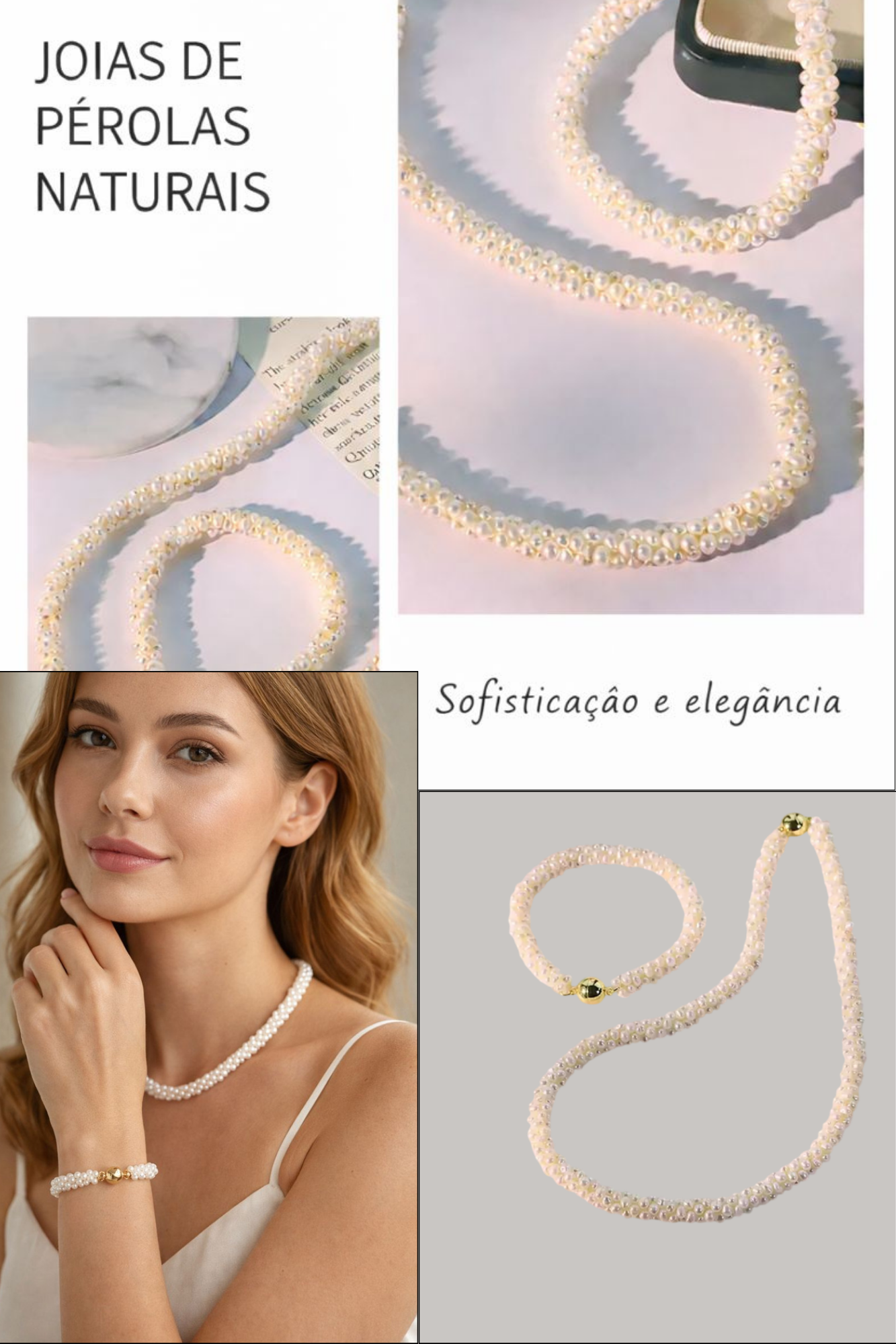 O brilho natural e irregular das pérolas confere personalidade ao conjunto, tornando cada peça única, ideal para festas e ocasiões especiais onde a elegância fala mais alto.